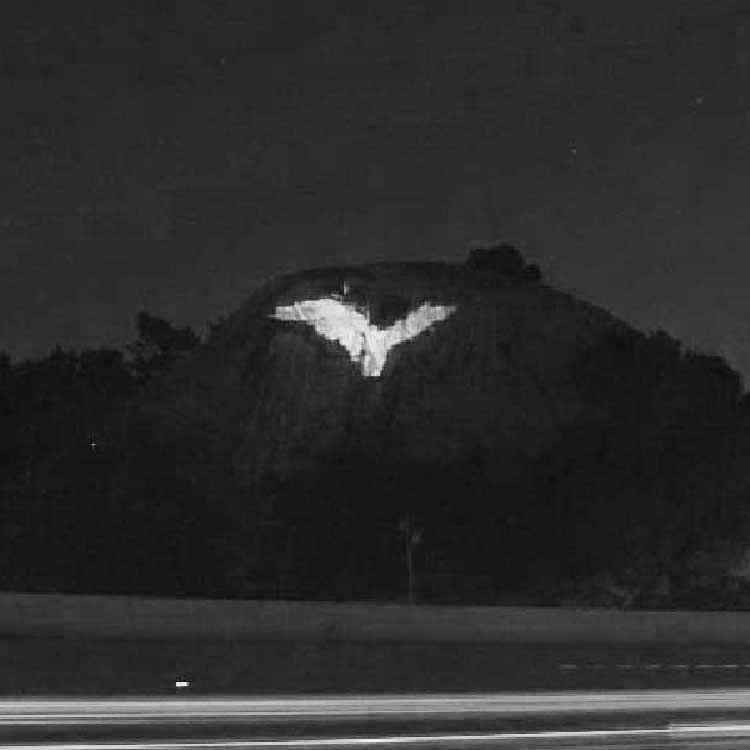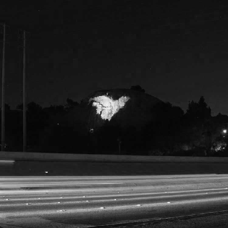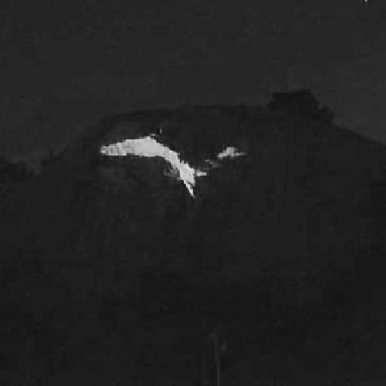 Time by the Rock(2004) was a temporary light projection on the Eagle Rock landmark in Northeast Los Angeles. This project was a collaboration with the Center for Arts, Eagle Rock. Projected images duplicate the shadows cast by the daily movement of the sun over the Rock, but at night, and reversing light and dark One of the first motion pictures produced by nature... but speeded up for contemporary nighttime travelers Postcard double as do-it-yourself flipbooks "Where time flies, time rocks!"